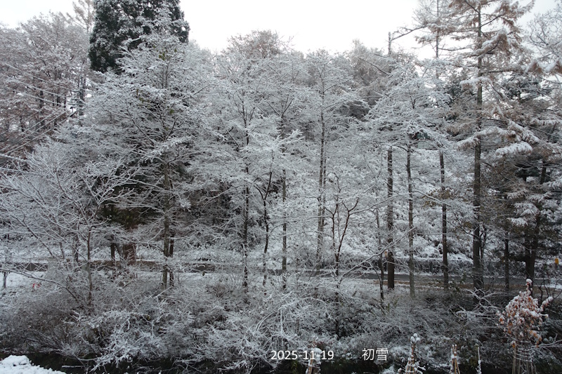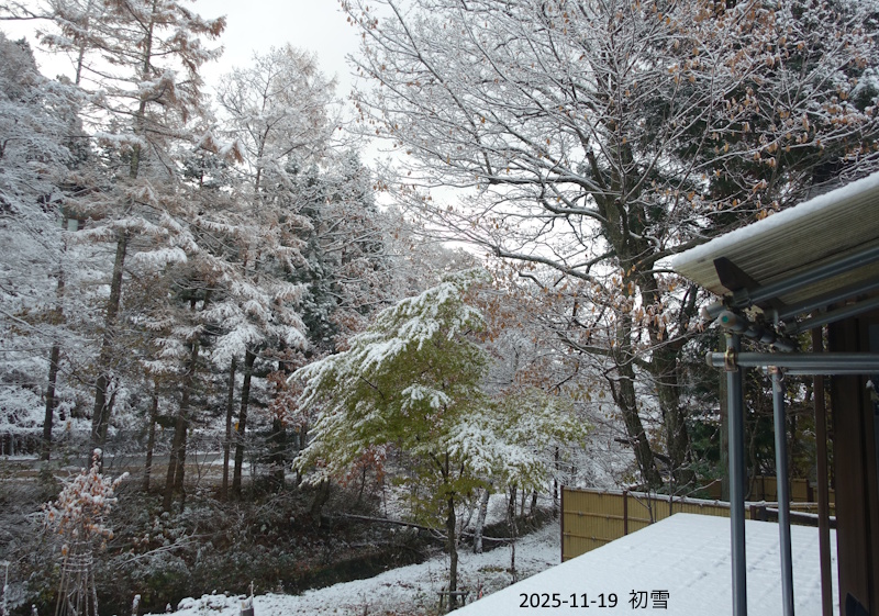 初雪 2025年11月19日 かもしか コメントする 2025-11-19(水) 後晴れ曇り 昨夜の冷たい雨降りは夜半に雪に変わったようです。朝7時頃の様子です。冷え込んでいます。かなり寒いです。一日中家の中。😊