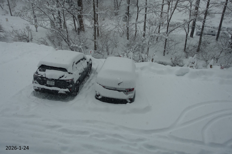 嬉しい大雪⛄⛄降りです。除雪した後からどんどん積もっていっています。お客様の車も雪に埋もれ始めました。