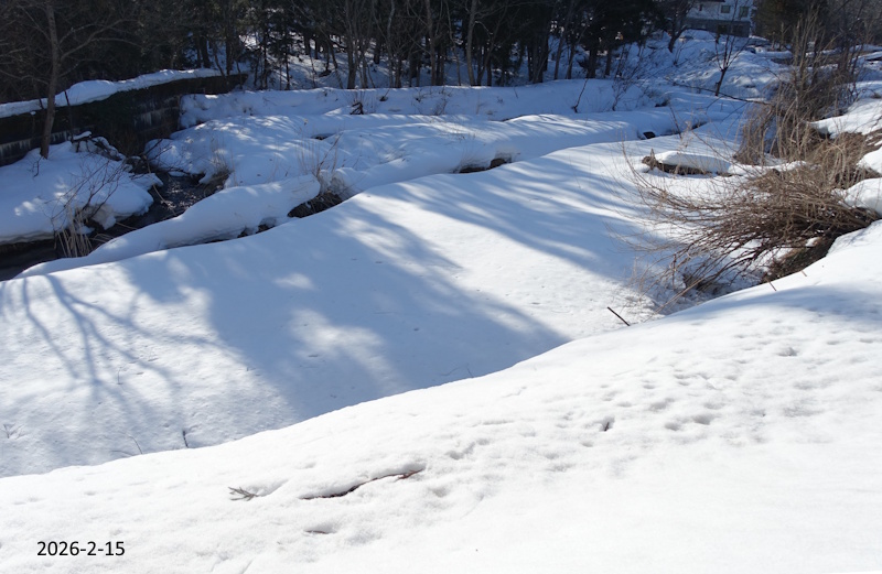 雪解け 2026年2月15日 かもしか コメントする 2/15(日) 全く!!はるを思わせる陽気になりました。雪解けが昨日より今日・・と進んでいるようです。 2月中旬から暖かくなるとは予報通りですが・・・もうちょっとゆっくり進んで・・・と思います。 ちょこっと散歩していると山肌に「カンアオイ」の緑の葉を見つけました。カンアオイの葉の裏には「ギフチョウ」が卵を産み付けます。ギフチョウのためにも大切にしたい植物ですね。 家のうらの川にはまだ雪がたくさん残っています。