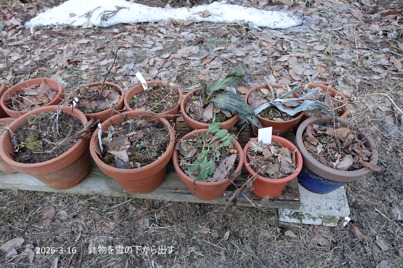 雪の下に埋めて保管してあった鉢も太陽の下へひっぱりだしました。