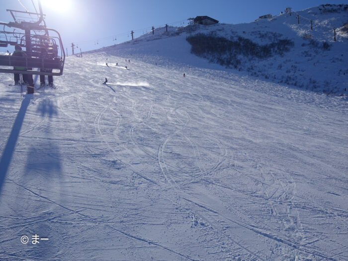 それだと滑る人が少なく午後でも十分綺麗な圧雪が残っていました。