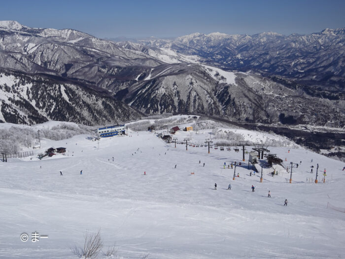 上部でも積もった雪は数センチ程で下地は硬くオフピステを滑る人はほとんど見かけません。