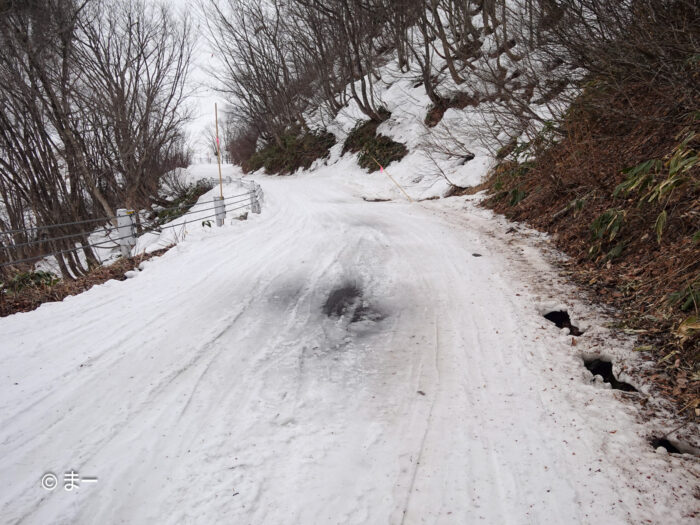 スカイラインからすぐはまだガードレールの頭が隠れるくらいの積雪ですがたてっこと合流する手前は道路が見えちゃっています。